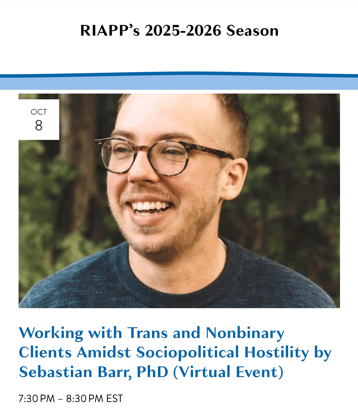 I’ll share a full update later this month, but wanted to let you know about an opportunity to continue expanding our capacity to meet trans clients’ needs in these challenging times. This evening from 7:30-9pm Eastern, I’ll be giving a talk titled Working with Trans and Nonbinary Clients Amidst Sociopolitical Hostility hosted by the Rhode Island Association for Psychoanalytic Psychologies.